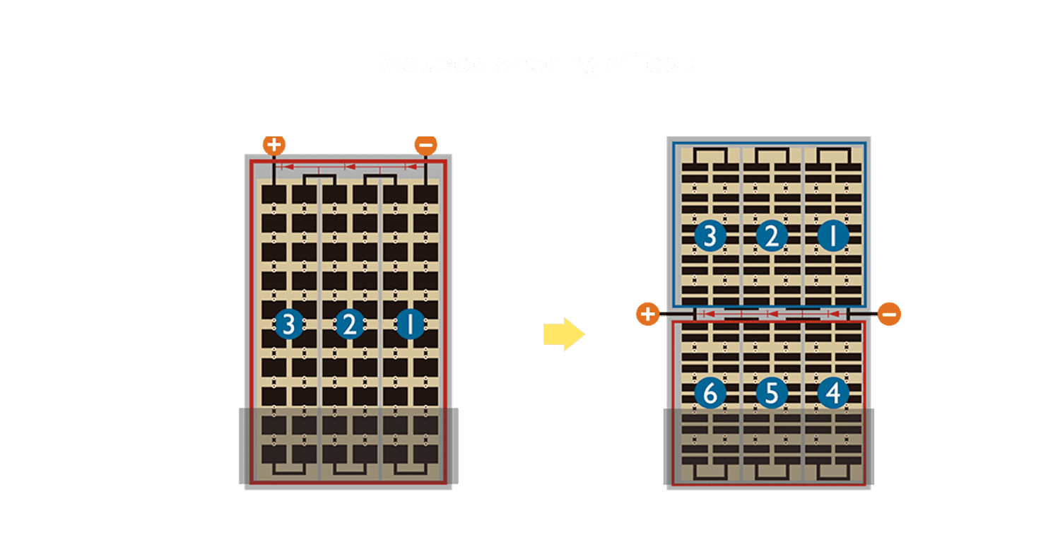 - 结合半切电池,,,,降低遮阴影响、、、、提升模组抗隐裂能力、、并减少电阻损耗,,,,进一步提升模组发电效能。。。。
